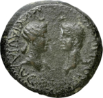 bare heads face to face of Claudia Octavia, to the right, and Nero, to the left; a crescent over Claudia Octavia's head and a star over Nero's |