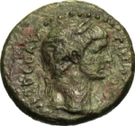 bust of Aphrodite, left; beneath, galley or dolphin |