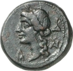 laureate head of Apollo, left; behind head, 2 monograms; below chin, monogram
