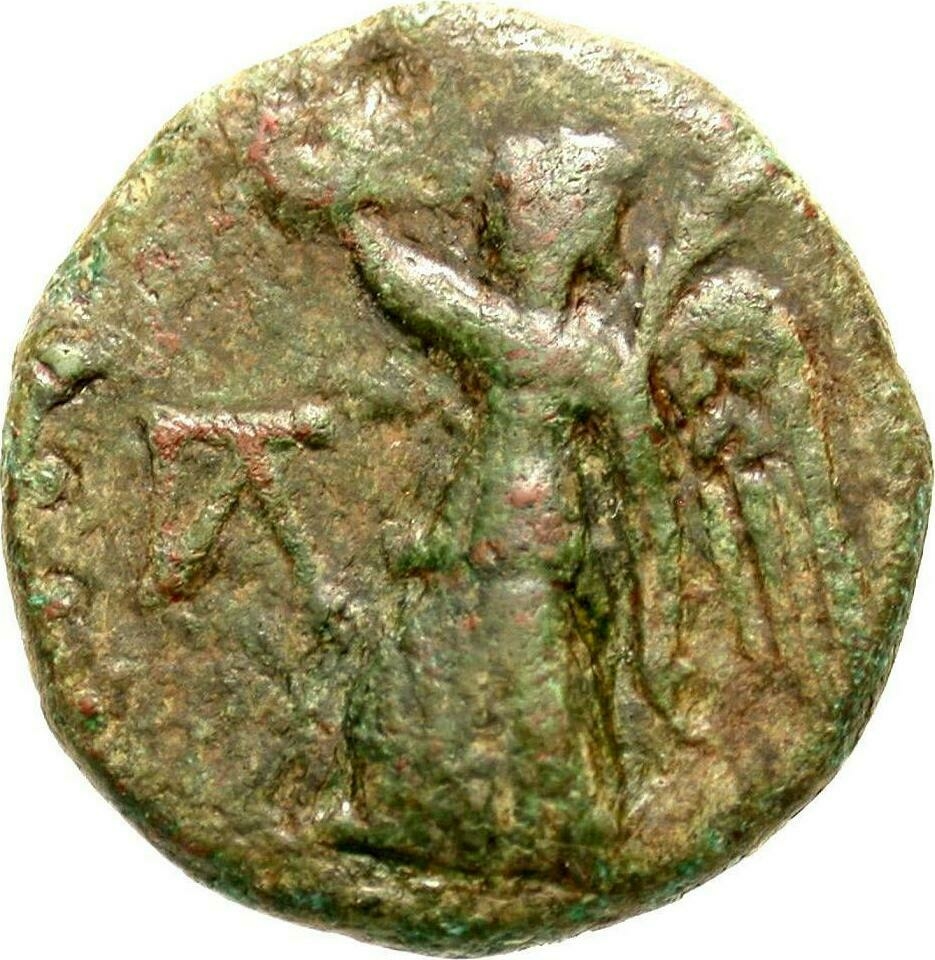 Nike standing, left, with wreath and palm; in, left field, monogram