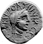 veiled head of Ceres (?), with wreath of ears of corn, right |