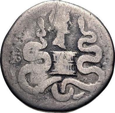 Fineness: 92% (Walker, Metrology I, 341–59). 98 coins, 68 obv. dies. See now B. Hiltmann, Les cistophores de Marc Antoine. Un monnayage hellénistique en contexte romain (Bordeaux, 2023), for a full die study. Based on the fact that some dies use an alpha with a broken bar, and some an alpha with a straight bar, and that there are no links between them, she suggests two mints (perhaps Ephesus and Pergamum?).