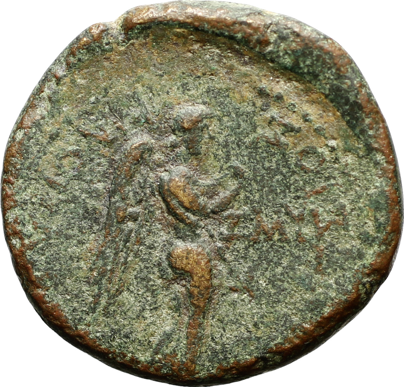 Nemesis standing, right, with caduceus; before, serpent |