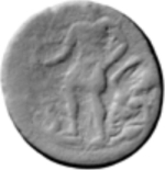 hero Miletos with aphlaston and spear standing left; foot on prow; river-god behind