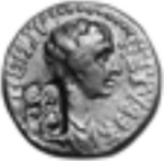 Cybele seated, right, holding patera in her right hand, drum at left shoulder |