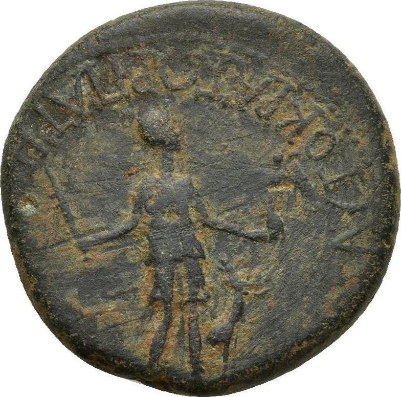 Artemis, standing facing, head right, holding short torch and Nike; stag behind |