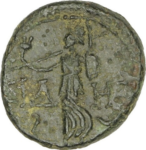 Athena advancing, left, with spear and pomegranate; on shoulder, shield; beside her, serpent