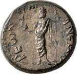 Poseidon standing left, holding dolphin and trident