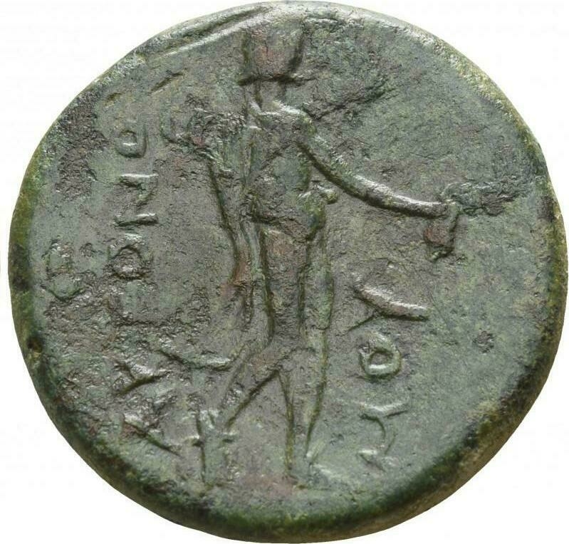 Hermes standing right, holding purse and caduceus.
