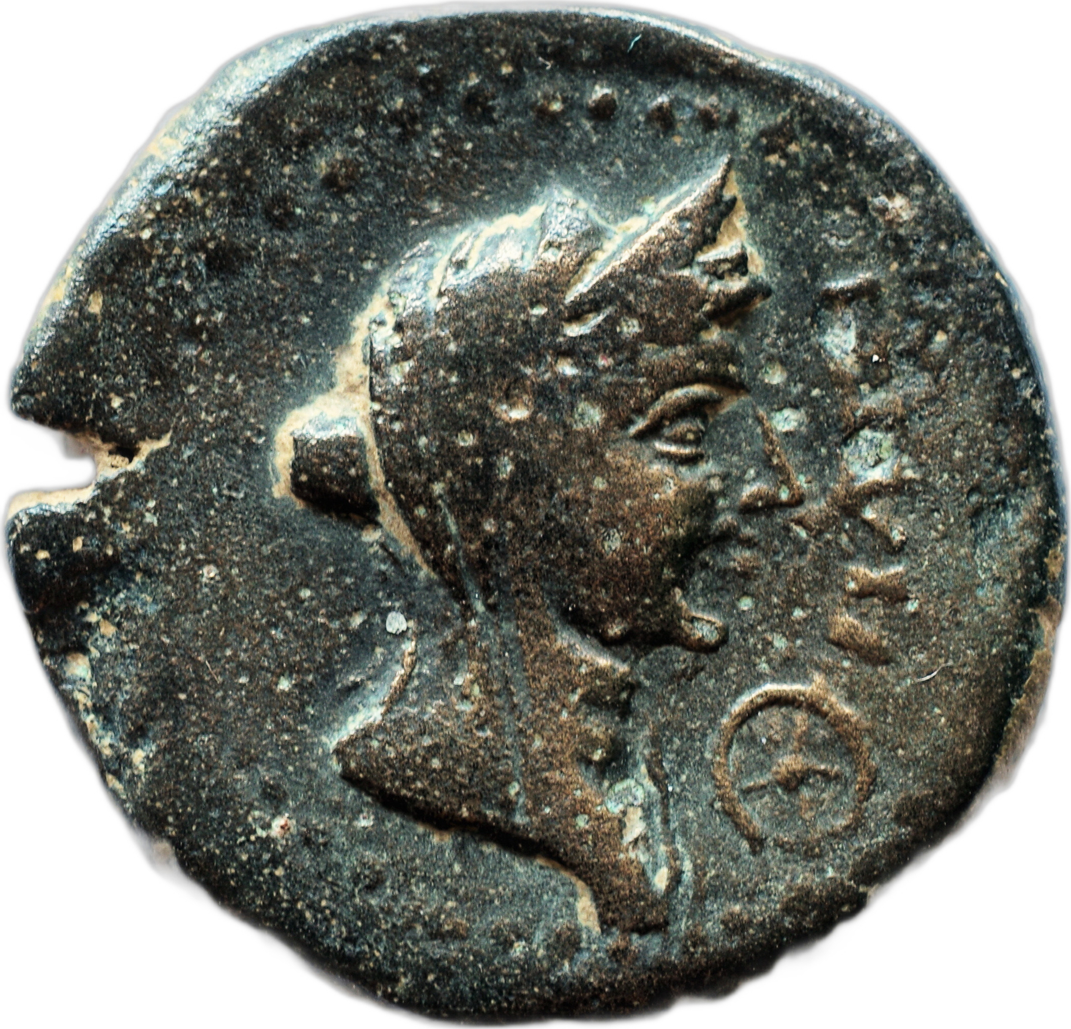 veiled and diademed head of Demeter, right; before, wheel (?)