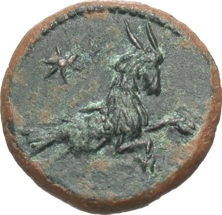 Previously attributed to Commagene (BMC Galatia, p. xlviii and p. 112), these coins were given by Hill to Cyprus (NC 1917, p. 24) where they occur frequently. A date under Augustus, due to the type of the capricorn, is possible, though by no means certain. Attributed by Nicolaou, op. cit. to Commagene (AD 38-72): see nos. 587-90 and p. 117, where it is said that these coins are found sporadically, not in large quantities, on the island (but there are 24 specimens in Nicosia Museum). If the reverse of this coin is orientated with star above (to match obverse) it has a die-axis of 12, which is the same as other Cypriot coins of Augustus: see I. A. Carradice, ‘The Coinage of Roman Cyprus’, in (ed) V. Tatton-Brown, Cyprus and the East Mediterranean in the Iron Age (London, 1989), pp. 182-87.