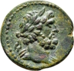 laureate head of Zeus, right, drapery on shoulder