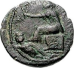 veiled Tyche, seated left, on throne, holding ears of corn; before, river god