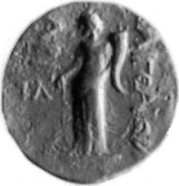 Tyche standing, left, with rudder and cornucopia