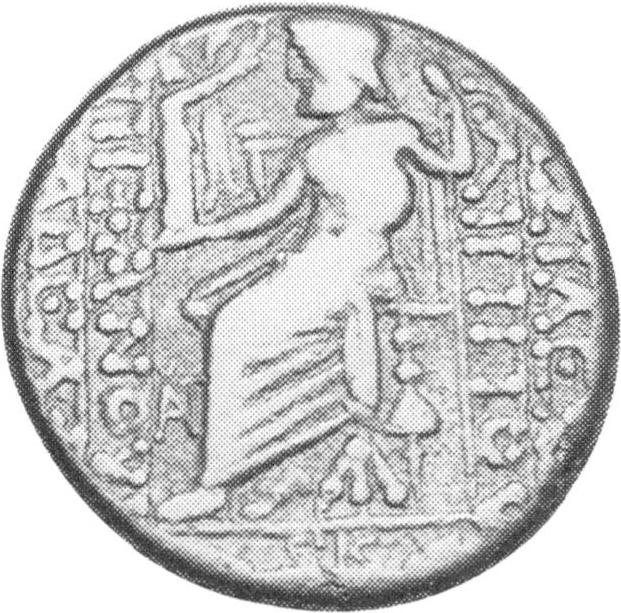 Zeus, seated left, holding Nike and sceptre |