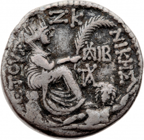 Tyche of Antioch seated, right, with palm branch; before river god Orontes |