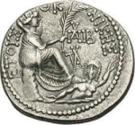 Tyche of Antioch seated, right, with palm branch; before river god Orontes |