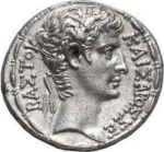 Tyche of Antioch seated, right, with palm branch; before river god Orontes |