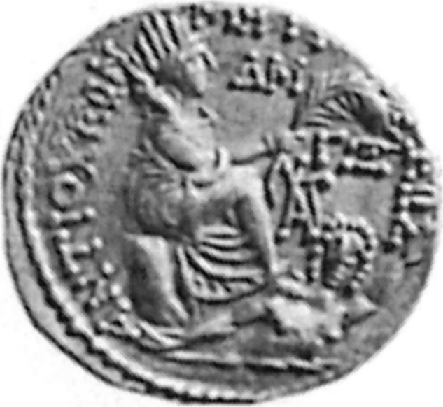Tyche of Antioch seated, right, with palm branch; before river god Orontes |