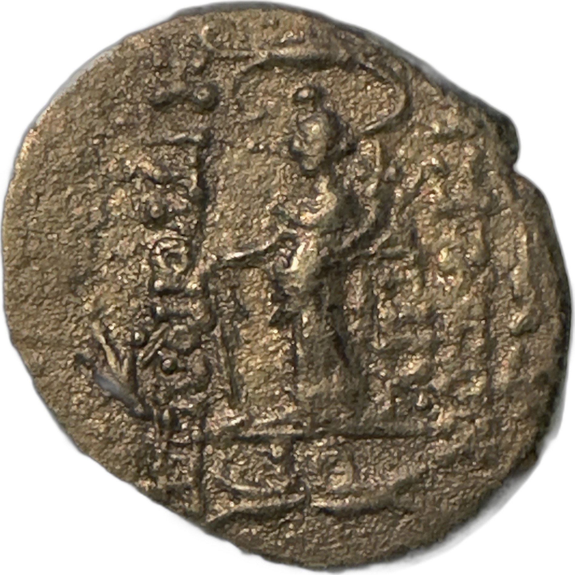 Tyche, standing left, holding rudder in right hand and cornucopia in left; date in exergue; above Tyche, thunderbolt; all within a laurel wreath |