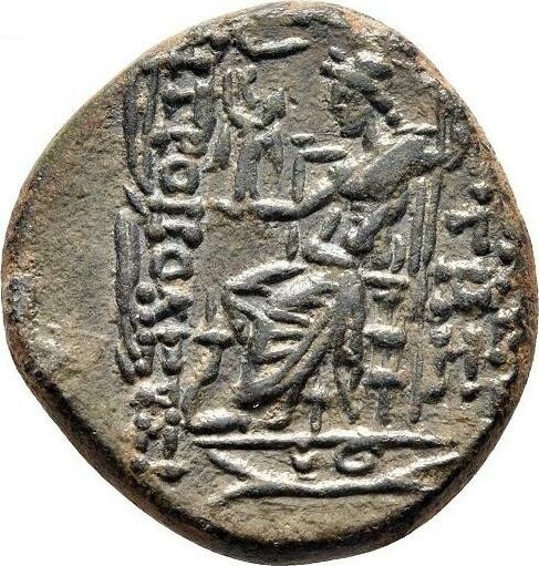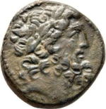 Zeus seated left, holding Nike and sceptre; date in exergue; above Zeus, thunderbolt; all in wreath (letters or symbols in fields) |