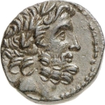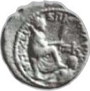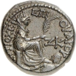 Tyche of Antioch seated, right, with palm branch; before river god Orontes |