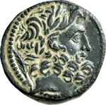 Tyche of Antioch seated, right, with palm branch; before river god Orontes |