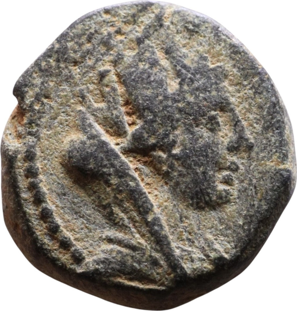 veiled and turreted head of Tyche, right