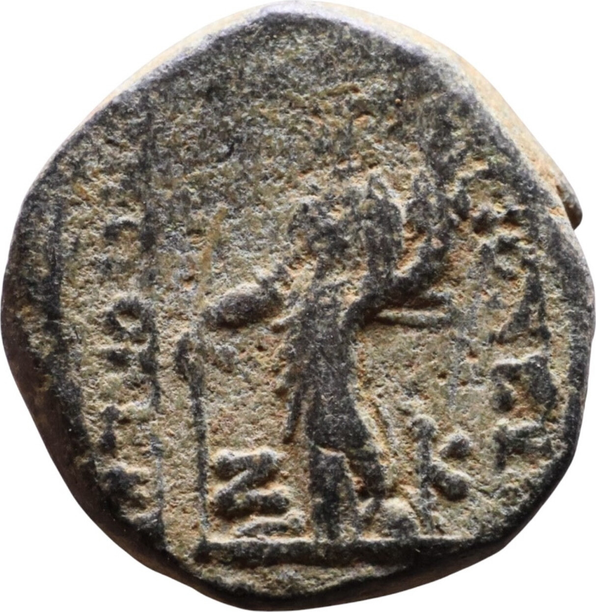 Tyche, standing left, holding baton and cornucopias