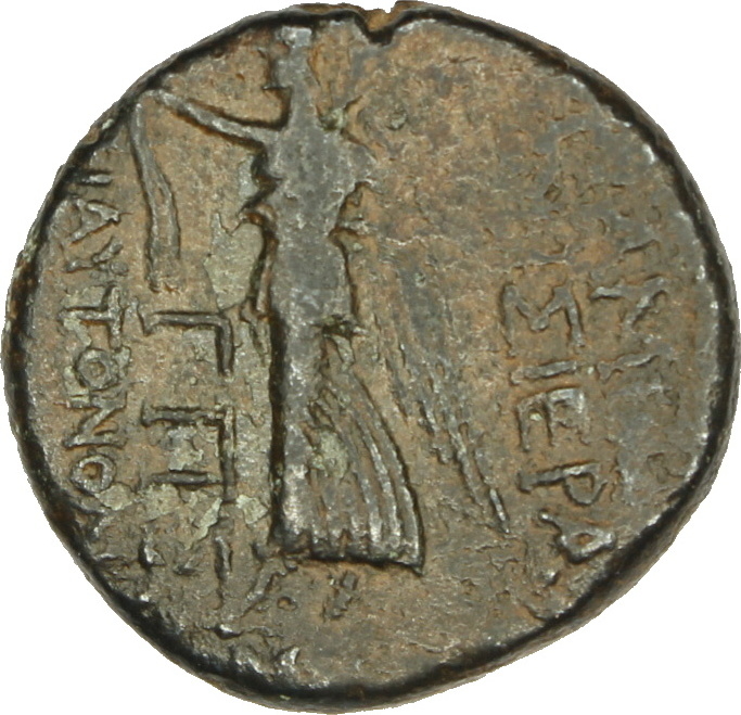 Nike advancing, left, with wreath and palm, various letters |
