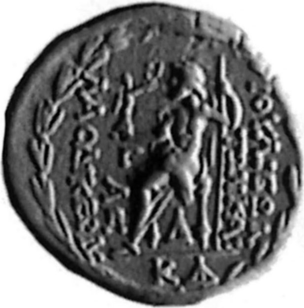 Zeus, seated left, holding Nike and sceptre; all in wreath; elsewhere in field, under throne and in exergue, various letters or monograms |