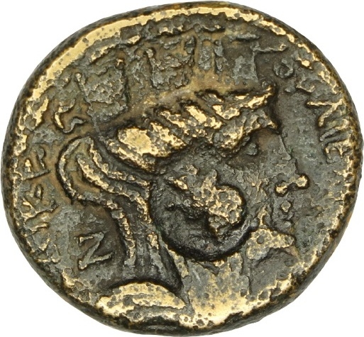 For other specimens, whose poor state of preservation precludes their precise attribution between 4444 and 4446: 8–10. O (8.74, 7.81, 8.41); 11. Cop 339 (8.60); 12–13. Lindgren 2070, A2070A (7.81, 8.68). For the star on the obv., see introduction. Countermarks: Head, r. (GIC 170: 9–11); 'ΙΔ' (GIC 720: 8). Although ΙΔ occurs on contemporary coins of Laodicea (4445), this countermark should probably be read the other way up as VI with a numeral line above. The countermark LVIF (GIC 726) is often found with a head (GIC 134), and these two countermarks are perhaps the Laodicean equivalents. The head, described by Howgego (GIC 170) as perhaps Apollo or a female, seems probably to be a helmeted head (most clearly on 4444/10 and 4445/2), i.e., a head of Athena as on the small 'pseudo-autonomous' bronzes, 4417–31.