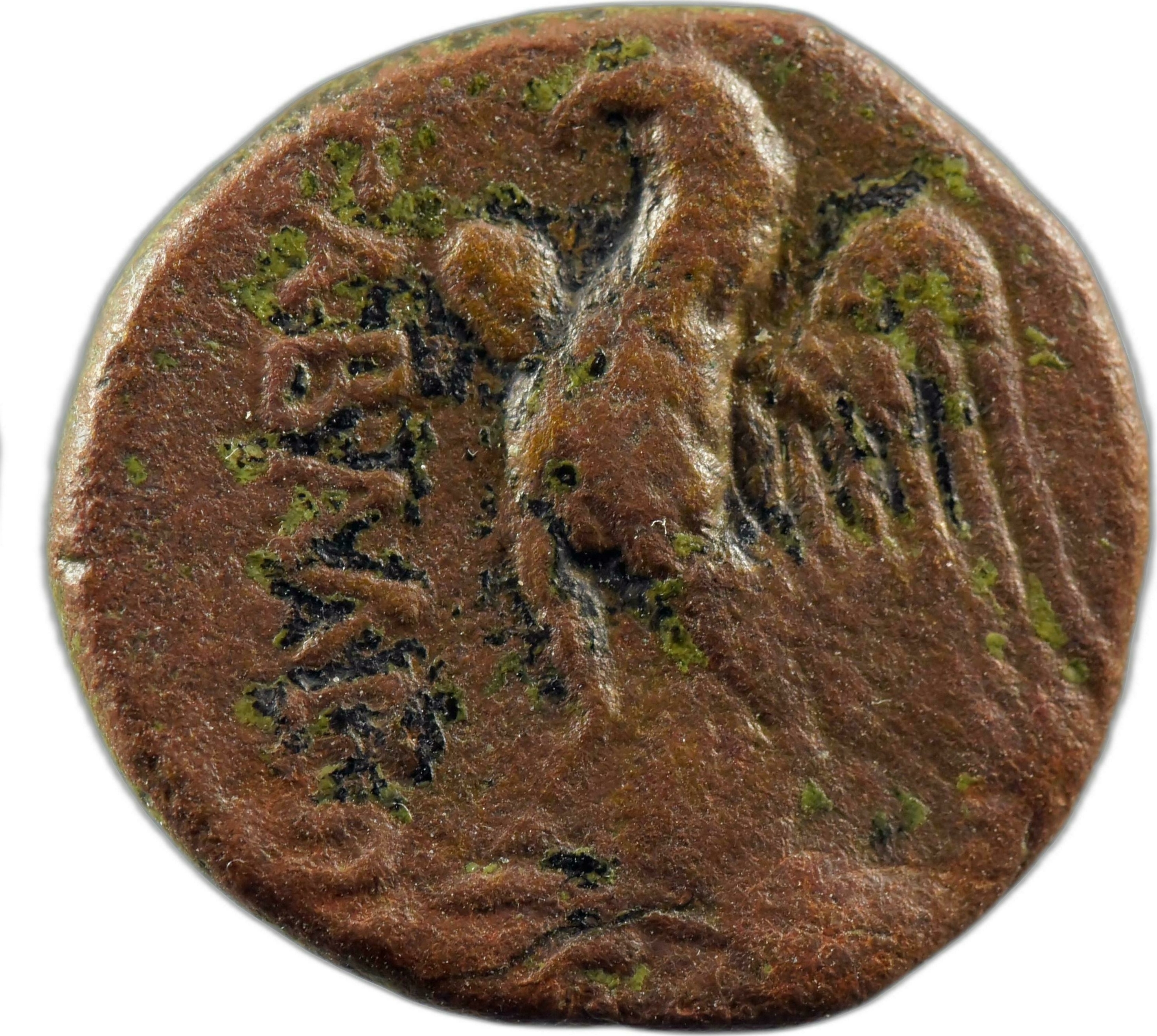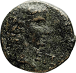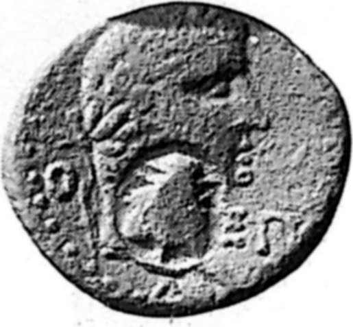 laureate head of Caligula, right; in left field, Ο or Θ; in right field, ΕΠ; below head, uncertain letter