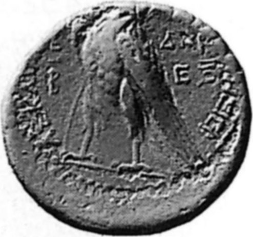 eagle with palm standing, left; monogram(s) or Greek letters |