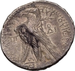 eagle standing, left, on prow of galley, and with palm on wing; to left, club; date in Greek numbers, with monogram or Greek letters; below eagle, Phoenician letter |
