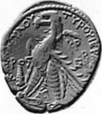 eagle standing, left, on prow of galley, and with palm on wing; to left, club; date in Greek numbers, with monogram or Greek letters; below eagle, Phoenician letter |