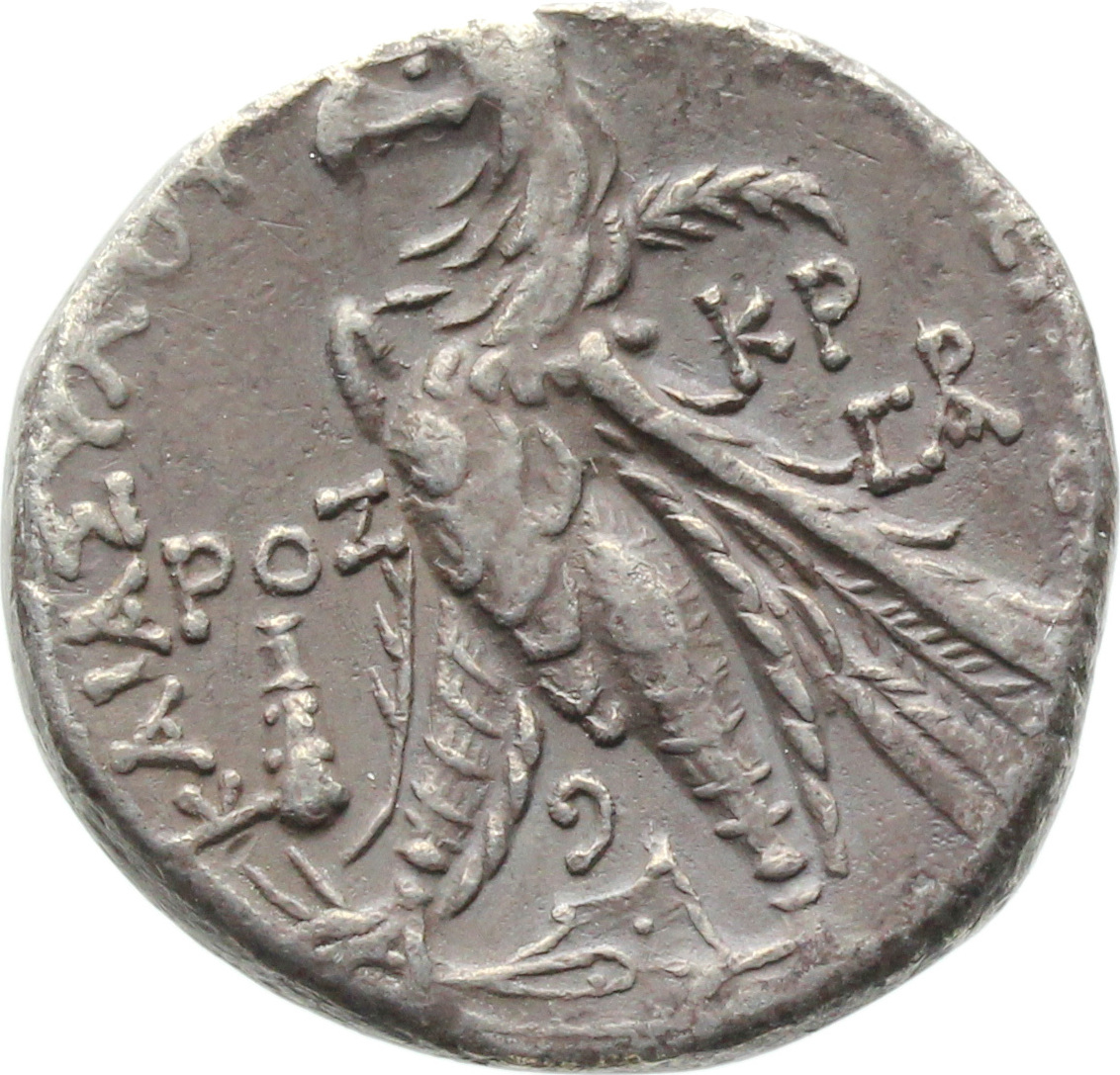 eagle standing, left, on prow of galley, and with palm on wing; to left, club; date in Greek numbers, with monogram or Greek letters; below eagle, Phoenician letter |