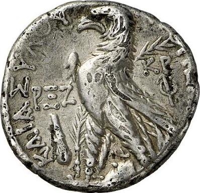eagle standing, left, on prow of galley, and with palm on wing; to left, club; date in Greek numbers, with monogram or Greek letters; below eagle, Phoenician letter |