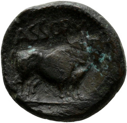 665 and 666 are dated to c. 200 BC by Campana, ‘Sicilia: Assoros (ca. 200 a.C.)’, part of Corpus Nummorum Antiquae Italiae (Zecche minori) in Panorama Numismatico 108 (Maggio 1996), pp. 137-40). He rejects the late dating, followed by RPC, but does not explain the use of Latin at so early a date.