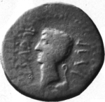bare head of Augustus, left; behind, lituus; all laurel wreath