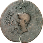 bare head of Augustus, l; in front, lituus; behind, praefericulum; all in laurel wreath