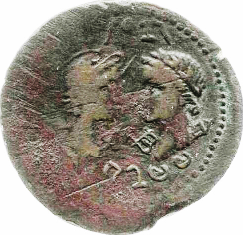 helmeted bust of Minerva, right, and laureate bust of Apollo, with cithara and quiver on shoulder