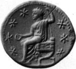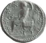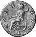 statue of Divus Augustus, in a toga, seated on a curule chair, holding patera and sceptre, left; Feet rest on stool; in the field, seven stars