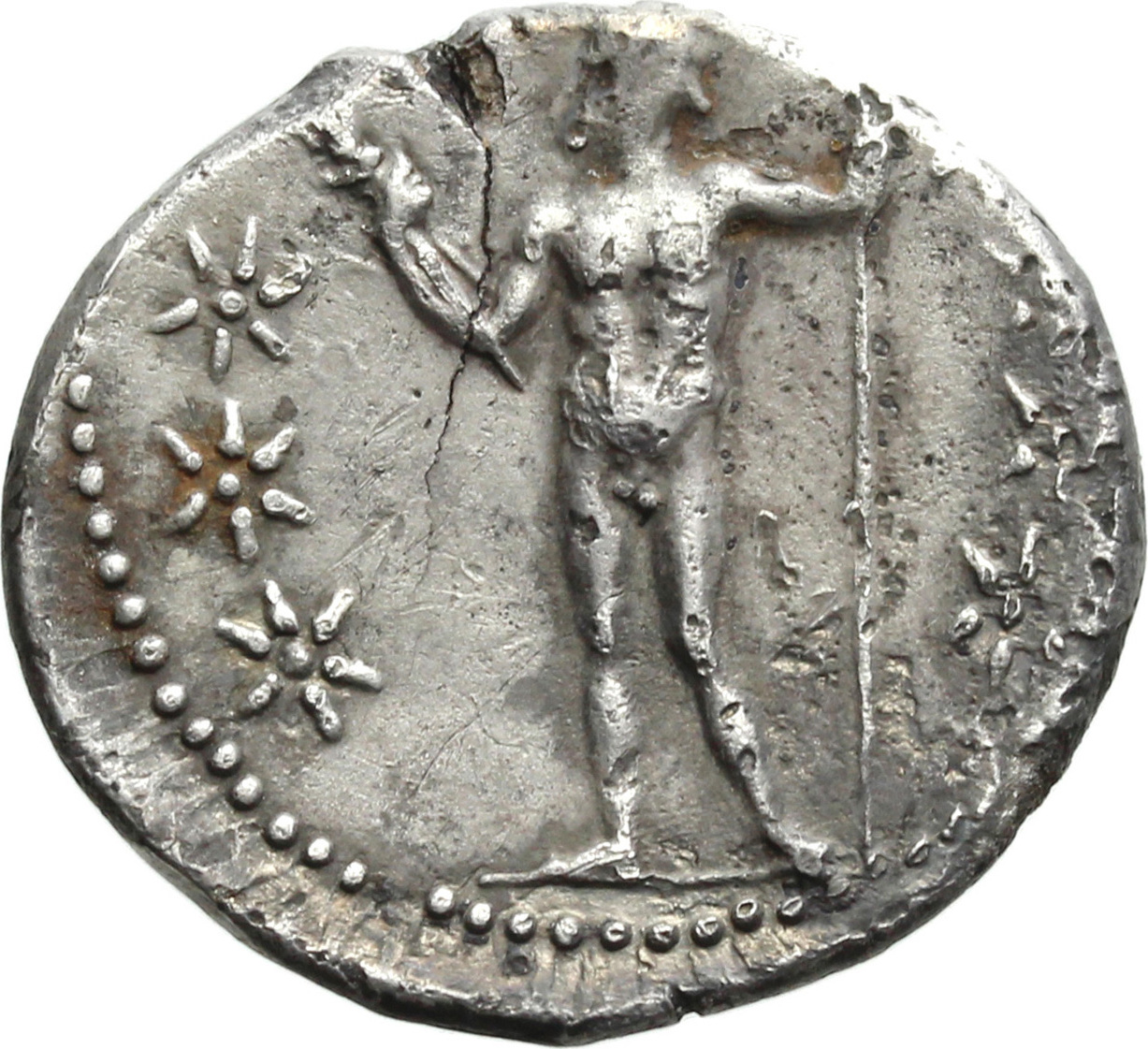 Zeus naked, standing left, holding thunderbolt and sceptre; in the field, seven stars