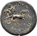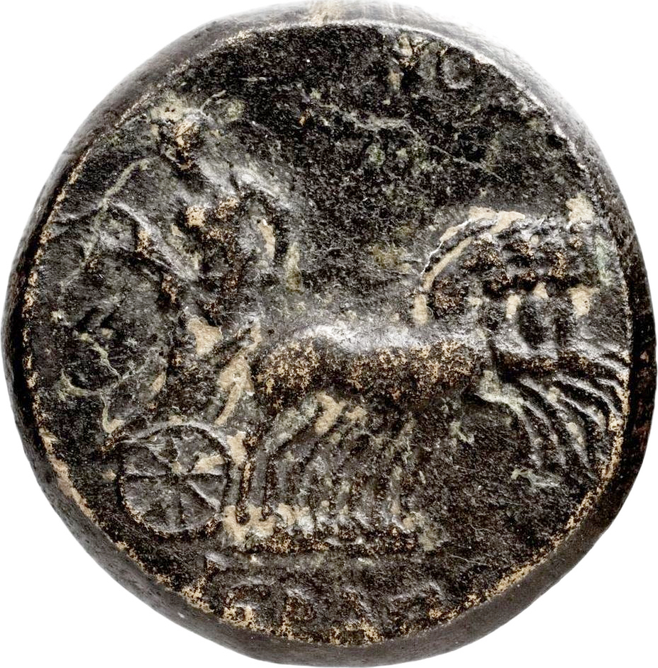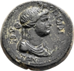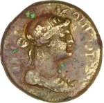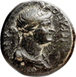 The obverse inscription facing outwards is a feature of the first and early second centuries (in RPC I-III). The 'portrait' of Dionysus looks quite like 1304, and lunate letters also occur in the Flavian period. If correctly dated, this type anticipates that used in the middle of the second century - see RPC IV. Confirmation required.