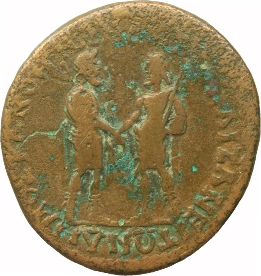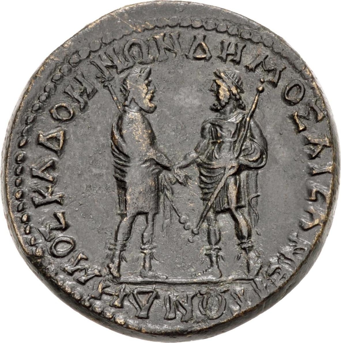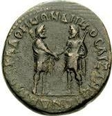 The word ΓΕΡΜΑ(Ν) is usually illegible. The forms Ɛ and Ϲ are also frequently found in rev. legends (e.g. 2-3). First published by H.P. Borrell, NC 1846, p. 20. Pera, Homonoia p. 29. Franke & Nollé give obv. legend as ΔΟΜΙΤΙΑΝΟΣ ΚΑΙΣΑΡ ΣΕΒΑ ΓΕΡΜΑ ΑΥΓ, but this is implausible, and anyway ΑΥΤΟ with a T rather than a Γ seems clear on BMC 142 and 141.