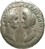 laureate head of Domitian looking right, facing draped bust of Domitia looking left