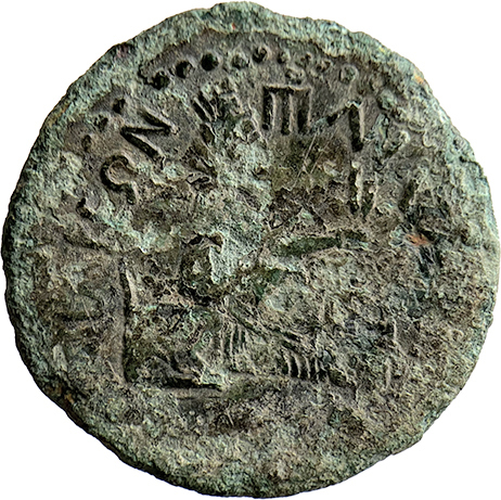 Tyche holding corn-ears seated, right; before, river god Pyramos; |