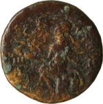 Roma seated left on arms, holding a globe, upon which is an eagle, with spread wings, and a wreath in its beak; shield at side