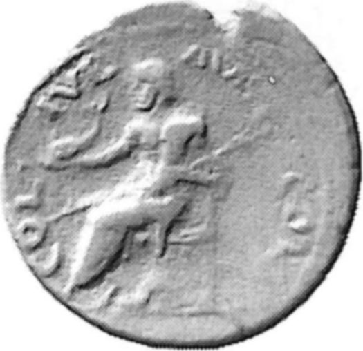 Neptune seated, left, holding dolphin and transverse sceptre (trident?)